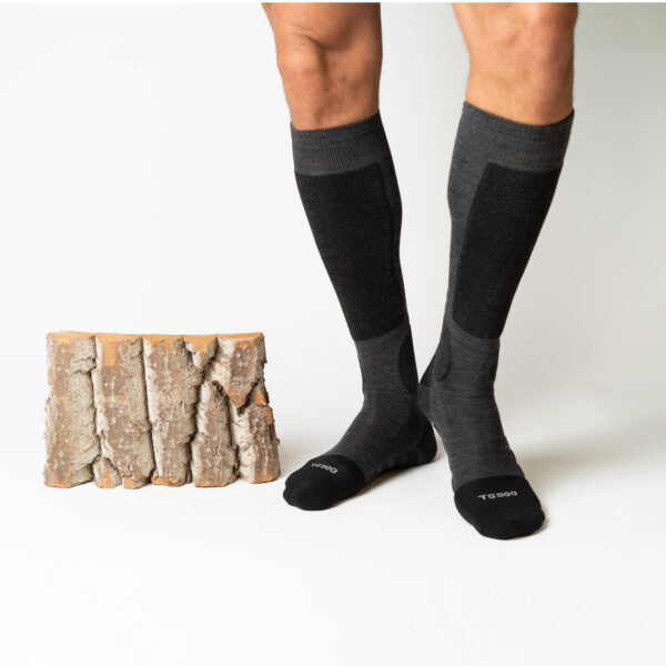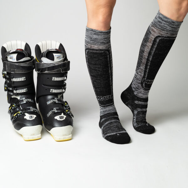 Do lyžařských bot patří ponožky určené speciální k lyžování, které dokonale odvádí od pokožky pot, mají anatomický tvar, disponují polstrováním na nejvíce namáhaných místech a pyšní se i skvělými tepelně-izolačními vlastnostmi.