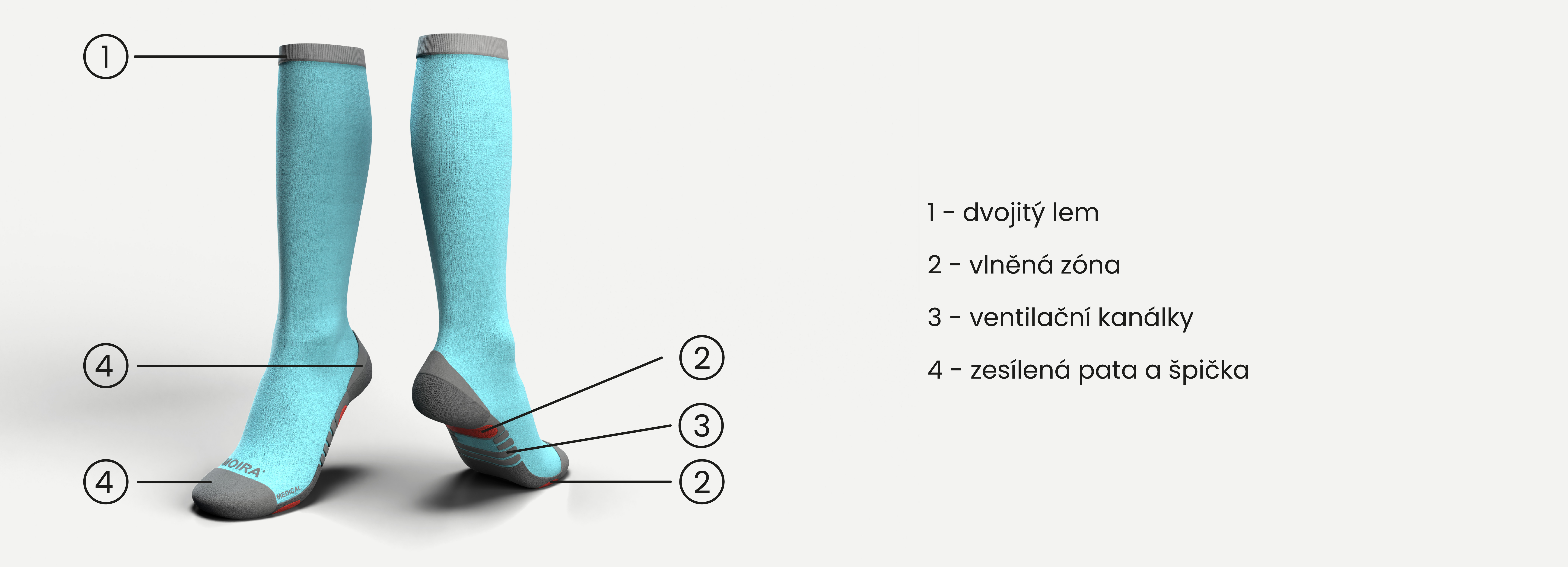 Zcela nová konstrukce podkolenek vychází z podrobných studií anatomie dolních končetin tak, aby byl dlouhodobě stabilizován optimální krevní oběh i při rozdílném fyzickém výkonu. Špička z plyšových smyček je oddělena od plochy chodidla ventilačním kanálkem napojeným na hladkou plochu nártu. Chodidlo, rovněž z plyšových smyček, je členěno systémem MFC (Moira Foot Canals), který umožňuje odvětrávání chodidla při každém nášlapu chodidla bez rozdílu, zda je ponožka na pravé či levé noze. Plyšová vazba také tlumí nárazy přenášené na nohu a pomáhá pohodlnému vymezení nohy v botě. Odvětrávací kanálky jsou napojeny na hladký nárt. Plyšová vazba je protažena nad patu, jako ochrana Achilovy šlachy. Na chodidle, pod klouby prstů a pod patou jsou zesílené plochy z vlněné vazby pro vyšší tlumení došlapu a absorpci vlhkosti. Speciální konstrukcí podkolenky je od špičky směrem k lemu spirálovitě vkládaný elastomer zaručující řízený svěr nohy, který se postupně směrem vzhůru zmenšuje. Svěr nohy je nastaven na fyziognomii zdravého člověka. Zaručuje lepší krevní oběh a tím i zásobování končetin potřebnými živinami a zejména kyslíkem. Zároveň zpevňuje svaly a šlachy, což se projevuje nejen při aktivním pohybu, ale i při regeneraci.