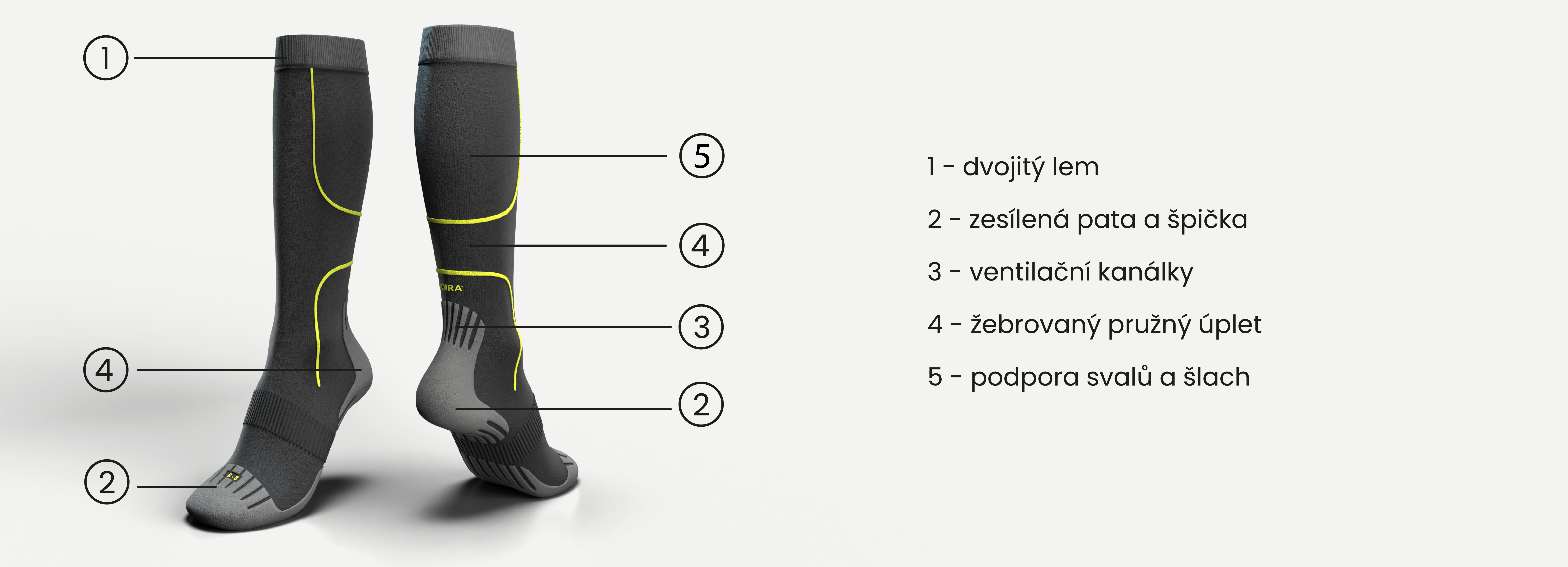 Kompresní výrobky jsou vhodné pro veškeré sporty, ocení je běžci, cyklisti, hráči míčových sportů, turisti a další sportovci. Smyslem komprese je ochránit svaly a šlachové úpony nohou před nadměrnými otřesy a možností zranění. Díky tomu se zkracuje doba nutná na regeneraci a předchází se vzniku otoků. Odstupňovaná komprese dále zrychluje činnost krevního a lymfatického řečiště při zásobování svalů živinami a kyslíkem a tím příznivě působí na celkový fyzický výkon. Zesílené plyšové zóny chodidla a špičky u ponožek a podkolenek tlumí nárazy, bandáž Achillovy šlachy chrání před otlakem a odřením. Konstrukce kompresních výrobků je nastavena podle fyziologie zdravého člověka. Nelze zaměňovat za zdravotní pomůcky.​