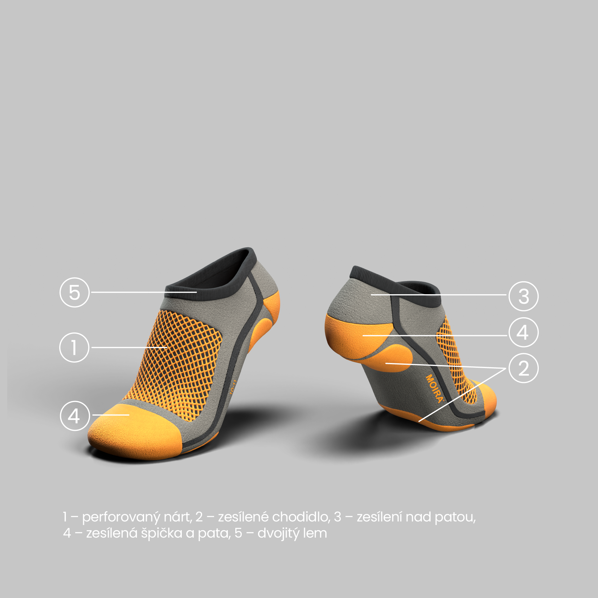 Víceúčelová, nízká ponožka určená do sandálové obuvi. Materiálové složení a stavba ponožky zaručuje příjemné nošení. Bavlna dokáže nasát až 8% vlhkosti, která při odvětrávání v sandálové obuvi nohy ochlazuje. Polypropylenová část konstrukce ponožky odvádí vlhko na vnější stranu pleteniny. Aby tento fyzikální proces probíhal s nejvyšším možným výkonem, je ve vazbě pleteniny použito patentované vlákno Moira TG 900 s pětilaločným profilem. Zesílenou špičku a patu spojuje hladký pruh udržující stálý tvar, nárt je odvětráván síťovaným povrchem. Větrání chodidla zajišťuje jemně žebrovaný úplet s perforací mezižeberních prostorů. Ponožku ukončuje nízký, dvojitý lem s jemným svěrem.