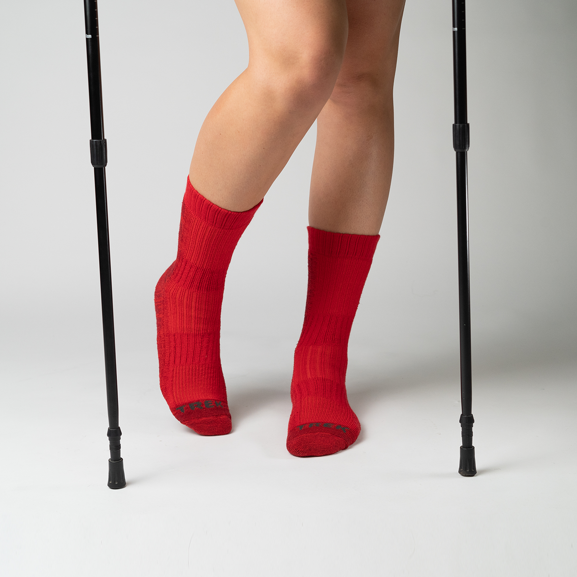 Ponožky pro turistiku Trek mají celý vnitřní povrch pokrytý smyčkou. Na spodní straně ponožky a nad patou až k lemu je smyčka hustější, nárt a část pod lemem je pletenina řidší a tomu odpovídá i vazba smyček. Vnitřní smyčky zajišťují dokonalý odvod vlhkosti při zachování dobré termoregulace nohy, zabraňují otlakům a vymezují nohu v botě. Špička a pata jsou materiálově zesíleny. Od špičky až k lemu ponožky jsou po stranách ponožky pružné zpevňovací pásy, oddělující spodní část od nártové části ponožky. Nárt až k horní části ponožky je vyplněn pružným, vzdušným úpletem, který umožňuje dobré odvětrávání přijaté vlhkosti. Přes nárt a chodidlo, a nad kotníkem je elastická bandáž zabraňující posunu ponožky v botě. Ponožka je ukončena nízkým pružným lemem s měkce přiléhavým svěrem.